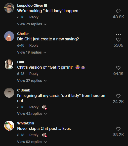 When you make content people want to interact with, the social media platforms take this as a sign of good content. Whether intentional or not, Chit inspired community, engagement, and UGC (user generated content), all things that will propel your content to grow.